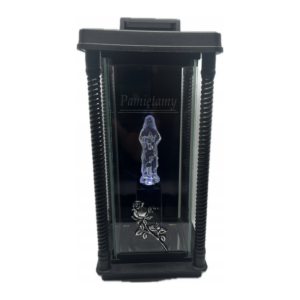 Elegancka kapliczka lampion „Pamiętamy” to symbol wiecznej pamięci o naszych najbliższych. Czarny lampion ze szklanymi szybkami i dekoracyjną różą wraz z wkładem przedstawiającym Maryję tworzy miejsca pełnego szacunku i godności. Wysokość 32 cm, szerokość 11 cm. Bezpieczne światło LED w ciepłym białym kolorze, ekologiczne – nie emituje CO2. Idealne na Wszystkich Świętych i całoroczne odwiedziny na cmentarzu.