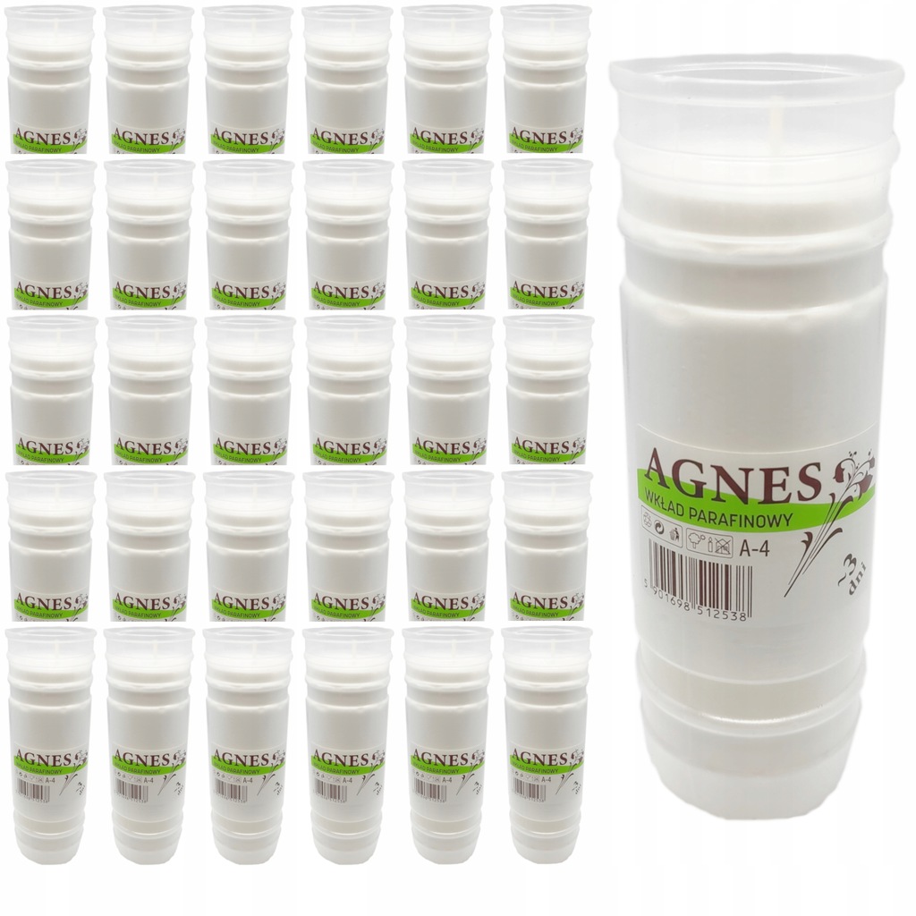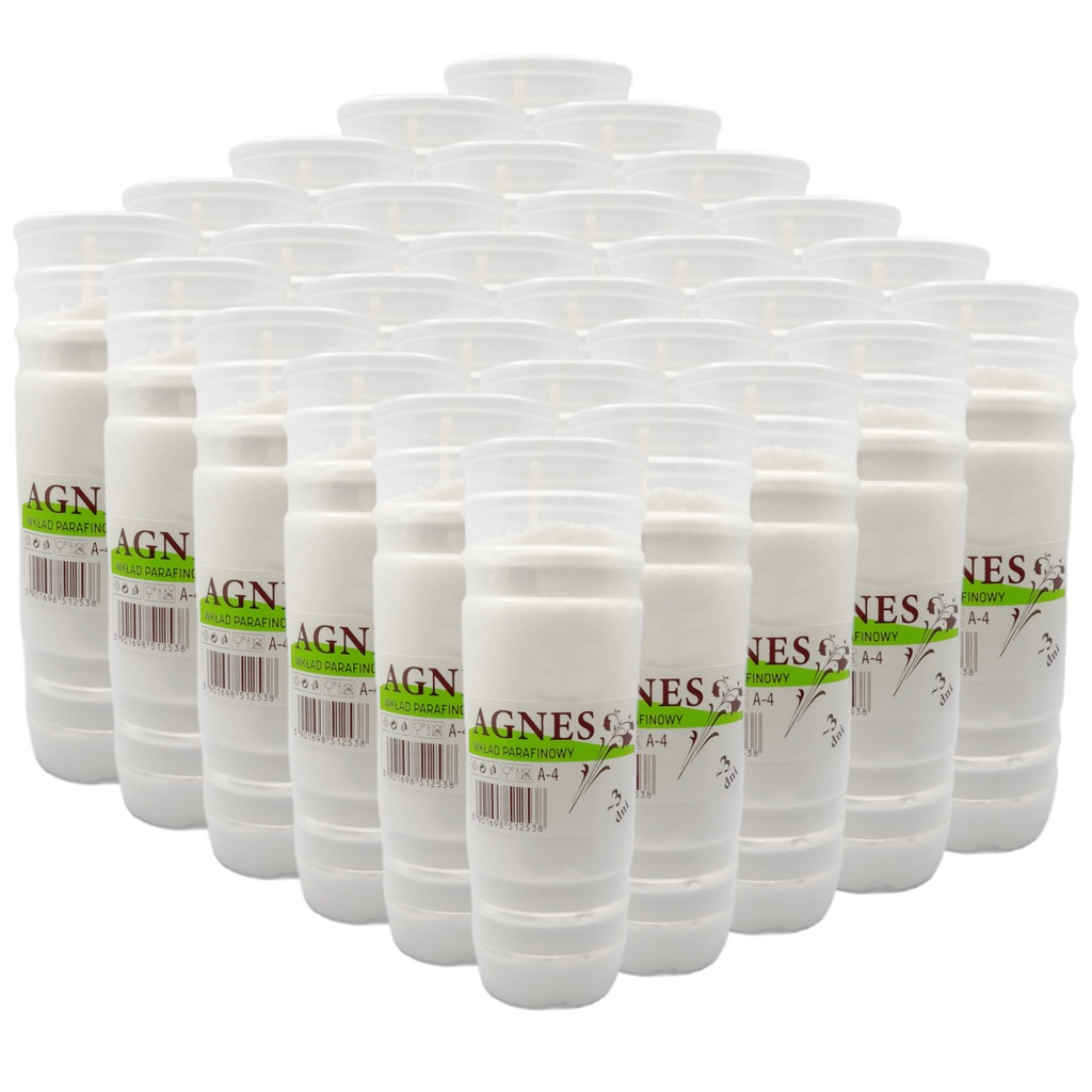 Wkłady parafinowe Agnes A-4 to tradycja połączona z nowoczesnością – godny sposób na oddanie hołdu zmarłym bliskim. Wykonane ze 100% białej parafiny w eleganckiej, błyszczącej tubie, zapewniają piękny jasny płomień przez długie godziny.
